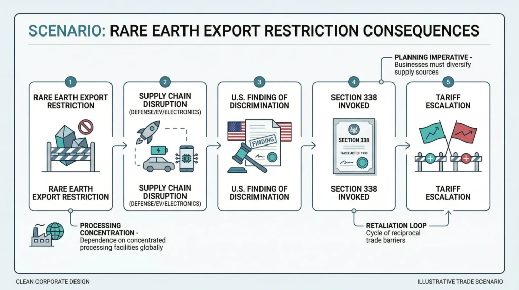 If China restricts rare earth exports again in response to Section 122 or Section 338 pressure, the administration has a near-perfect legal fact pattern for invoking Section 338 in return…country-specific, documented, WTO-condemned discrimination against U.S. commerce, deployed as explicit economic retaliation. That is not a hypothetical. It is the most likely tripwire that gets this statute actually used for the first time in 96 years.
