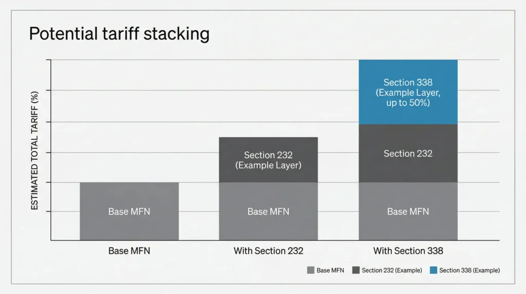 Consider what that looks like on the ground. A steel product currently faces a 25 percent Section 232 tariff stacked on a base MFN rate. Add a Section 338 finding of discrimination against the country of origin…up to 50 percent additional…and the effective rate on that product could reach 80, 90, or higher depending on the baseline.