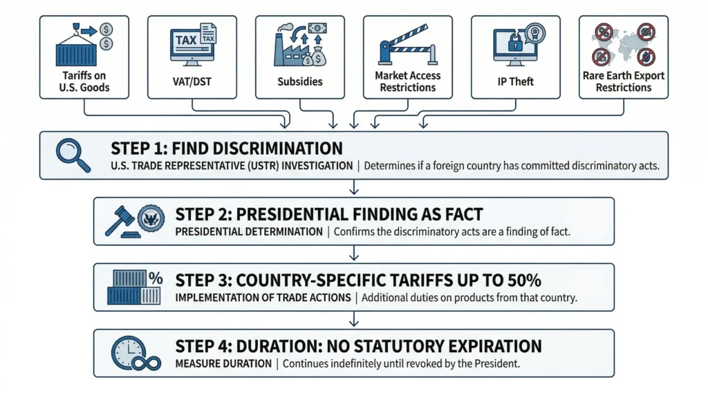 Under Section 338, the president needs to “find as a fact” that discrimination exists. The WTO already found it. The U.S. government was the one arguing the case. That factual predicate isn’t being constructed from scratch…it’s sitting in a decade-old adjudicated record, updated by China’s own 2025 conduct.
