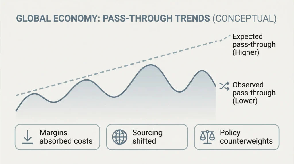 Across economists, central bank commentary, sell‑side research, and industry surveys, a consistent pattern emerged: the pass‑through from tariffs to consumer prices was smaller, slower, and more uneven than predicted. Costs showed up in pockets, were absorbed in margins, or were offset through sourcing shifts and pricing adjustments.